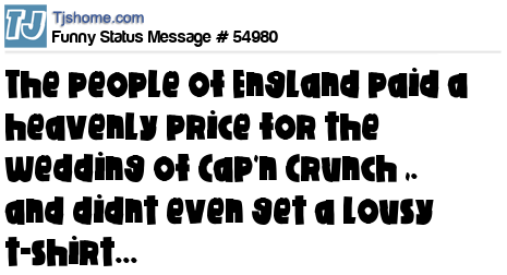 X  The people of England paid a heavenly price for the wedding of Cap'n Crunch ,. and didnt even get a lousy t-shirt...