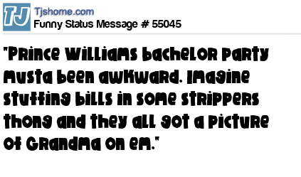 X is "Prince Williams bachelor party musta been awkward. Imagine stuffing bills in some strippers thong and they all got a picture of Grandma on em."
