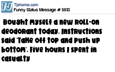 X says Bought myself a new roll-on deodorant today. Instructions said 'Take off top and push up bottom'. Five hours I spent in casualty