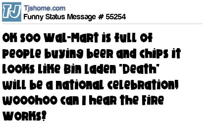 X is Ok soo Wal-Mart is full of people buying beer and chips it looks like Bin Laden "Death" will be a national celebration! wooohoo can I hear the Fire Works?