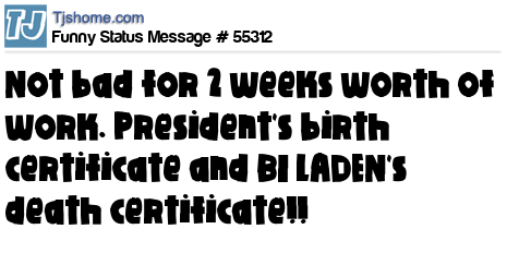 X is Not bad for 2 weeks worth of work. President's birth certificate and BI LADEN's death certificate!!