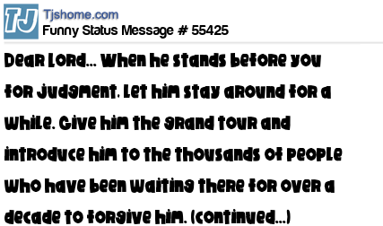 X Dear Lord... When he stands before you for judgment, let him stay around for a while. Give him the grand tour and introduce him to the thousands of people who have been waiting there for over a decade to forgive him. (continued...)
