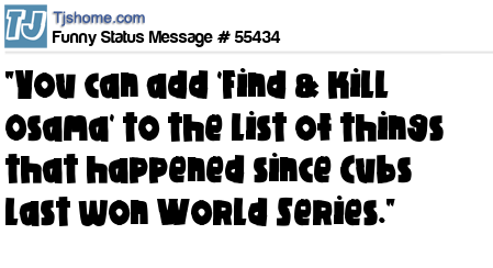 - # 55572 you can add "Found and killed Bin Laden" to the list of things that have happened since the Cubs last won the World Series!!!