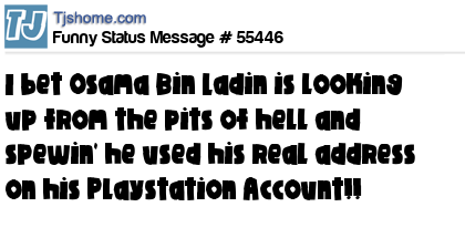 X says I bet Osama Bin Ladin is looking up from the pits of hell and spewin' he used his real address on his Playstation Account!!