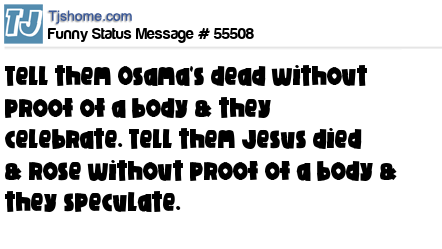 X Tell them Osama's dead without proof of a body & they celebrate. Tell them Jesus died & rose without proof of a body & they speculate.