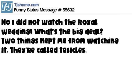 X No I did not watch the Royal wedding! What's the big deal? Two things kept me from watching it. They're called tesicles.