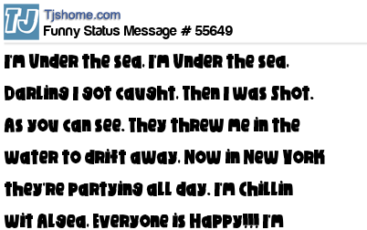 X I'm Under the sea, I'm Under the sea, Darling I got caught, Then I was Shot. As you can see. They threw me in the water to drift away, Now in New York they're partying all day. I'm Chillin wit Algea, Everyone is Happy!!! I'm Under the sea!