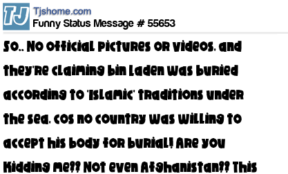 X is So.. No official pictures or videos, and they're claiming bin Laden was buried according to 'Islamic' traditions under the sea, cos no country was willing to accept his body for burial! Are you kidding me?? Not even Afghanistan?? This is by far the most f