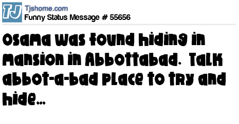 X Osama was found hiding in mansion in Abbottabad. Talk abbot-a-bad place to try and hide…