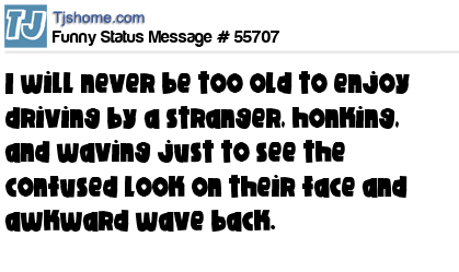 X I will never be too old to enjoy driving by a stranger, honking, and waving just to see the confused look on their face and awkward wave back.