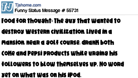 X Food for thought: The guy that wanted to destroy Western civilization, lived in a mansion, near a golf course, drank both Coke and Pepsi products while urging his followers to blow themselves up. No word yet on what was on his iPod.
