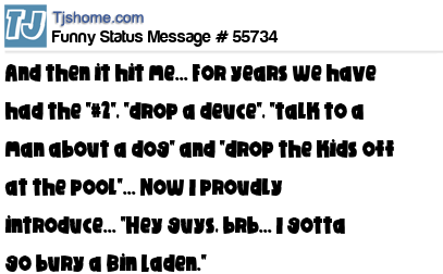 X And then it hit me... For years we have had the "#2", "drop a deuce", "talk to a man about a dog" and "drop the kids off at the pool"... Now I proudly introduce... "Hey guys, brb... I gotta go bury a Bin Laden."