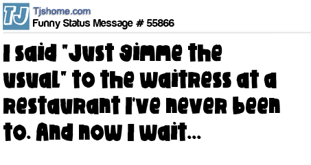 X I said "Just gimme the usual" to the waitress at a restaurant I've never been to. And now I wait...