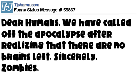 X is Dear Humans, We have called off the apocalypse after realizing that there are no brains left. Sincerely, Zombies.
