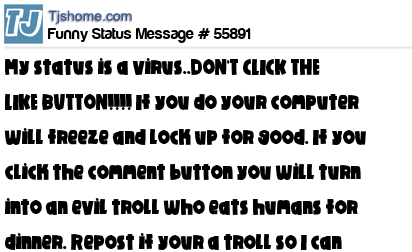 X is My status is a virus..DON'T CLICK THE LIKE BUTTON!!!! If you do your computer will freeze and lock up for good. If you click the comment button you will turn into an evil troll who eats humans for dinner. Repost if your a troll so I can run and hide.