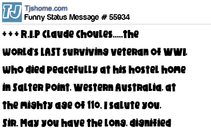 X is + + + R.I.P Claude Choules.....the world's LAST surviving veteran of WWI, who died peacefully at his hostel home in Salter Point, Western Australia, at the mighty age of 110. I salute you, Sir. May you have the long, dignified sleep you deserve. + + +