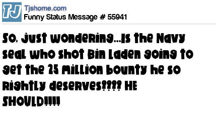 X So, just wondering...Is the Navy seal who shot Bin Laden going to get the 25 million bounty he so rightly deserves???? HE SHOULD!!!!