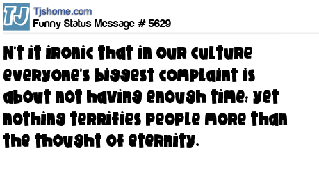 X n't it ironic that in our culture everyone's biggest complaint is about not having enough time; yet nothing terrifies people more than the thought of eternity.