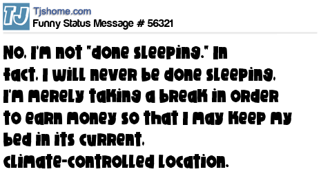 X is No, I'm not "done sleeping." In fact, I will never be done sleeping, I'm merely taking a break in order to earn money so that I may keep my bed in its current, climate-controlled location.
