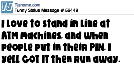 - # 62257 I love to stand in line at ATM machines, and when people put in their PIN, I yell "GOT IT" then run away!!!
