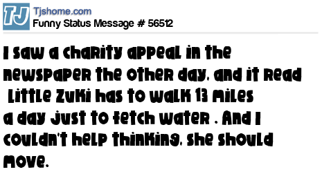 X I saw a charity appeal in the newspaper the other day, and it read “Little Zuki has to walk 13 miles a day just to fetch water”. And I couldn't help thinking, she should move.