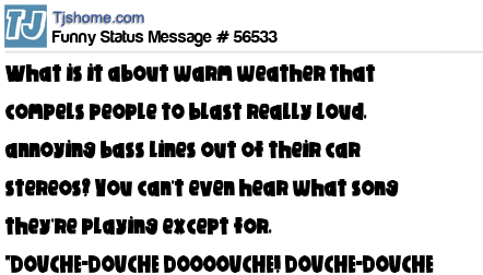 X says What is it about warm weather that compels people to blast really loud, annoying bass lines out of their car stereos? You can't even hear what song they're playing except for, "DOUCHE-DOUCHE DOOOOUCHE! DOUCHE-DOUCHE DOOOOUCHE!"