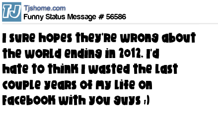 X I sure hopes they're wrong about the world ending in 2012. I'd hate to think I wasted the last couple years of my life on Facebook with you guys ;)