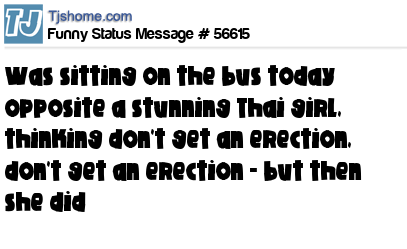 - # 120512 I was sitting across the bus today from a very sexy Thai girl...and I kept saying to myself "Don't get an erection , Don't get an erection"....But she did
