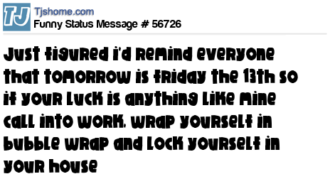 X is just figured i'd remind everyone that tomorrow is friday the 13th so if your luck is anything like mine call into work, wrap yourself in bubble wrap and lock yourself in your house