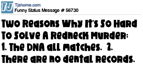 - # 60753 Two Reasons Why It's So Hard To Solve A Redneck Murder: 1. The DNA all matches. 2. There are no dental records.