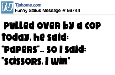 - # 67572 I got pulled over by a cop today and he said PAPERS and I said SCISSORS--I WIN!!! Then he made me get out of my car and do a bunch of tests. Sore loser!!!