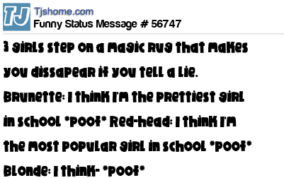 X 3 girls step on a magic rug that makes you dissapear if you tell a lie. Brunette: I think I'm the prettiest girl in school *poof* Red-head: I think I'm the most popular girl in school *poof* Blonde: I think- *poof*