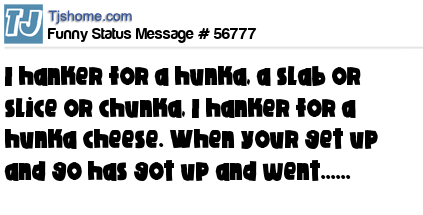 X says I hanker for a hunka, a slab or slice or chunka, I hanker for a hunka cheese. When your get up and go has got up and went......