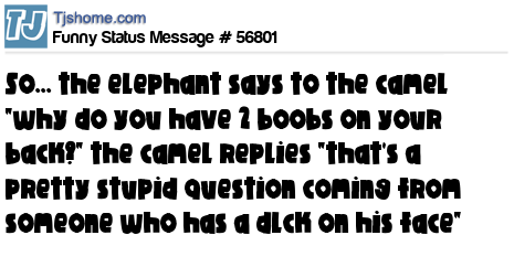 X So... the elephant says to the camel "why do you have 2 boobs on your back?" the camel replies "that's a pretty stupid question coming from someone who has a dlck on his face"