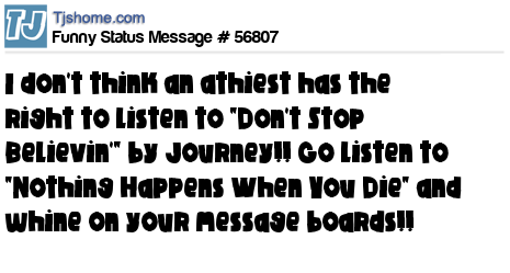 X is I don't think an athiest has the right to listen to "Don't Stop Believin'" by Journey!! Go listen to "Nothing Happens When You Die" and whine on your message boards!!