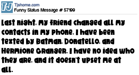 X is Last night, my friend changed all my contacts in my phone. I have been texted by Batman, Donatello, and Hermione Granger. I have no idea who they are, and it doesn't upset me at all.