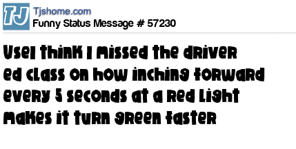 - # 52800 I think I missed the driver ed class on how inching forward every 5 seconds at a red light makes it turn green faster.