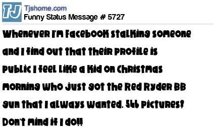 X says Whenever I'm Facebook stalking someone and I find out that their profile is public I feel like a kid on Christmas morning who just got the Red Ryder BB gun that I always wanted. 546 pictures? Don't mind if I do!!