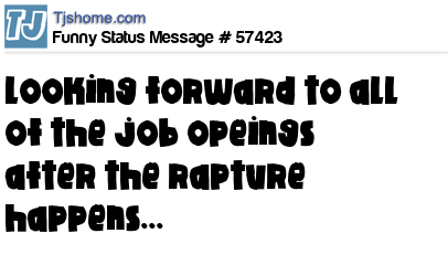 - # 57654 I am actually looking forward to the rapture....To all the women who told me "I wouldn't sleep with you unless you were the last man on earth" Look out ladies here I come!