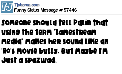X Someone should tell Palin that using the term "lamestream media" makes her sound like an '80's movie bully. But maybe I'm just a spazwad.