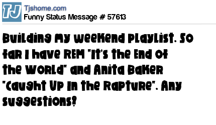 X says building my weekend playlist. So far I have REM "It's the End of the World" and Anita Baker "Caught Up In the Rapture". Any suggestions?