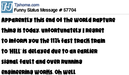 X says Apparently this end of the world rapture thing is today, unfortunately I regret to inform you the 1124 fast track train to 'HELL' is delayed due to an earlier signal fault and over running engineering works, Oh well