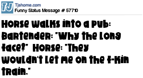 X Horse walks into a pub: Bartender: "Why the long face?" Horse: "They wouldn't let me on the f-kin train."