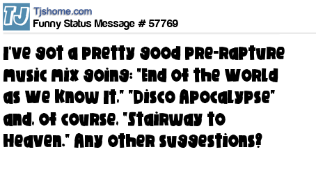 X I've got a pretty good pre-rapture music mix going: "End of the World as We Know It," "Disco Apocalypse" and, of course, "Stairway to Heaven." Any other suggestions?