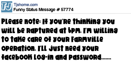X says Please note: If you're thinking you will be raptured at 6pm, I'm willing to take care of your Farmville operation. I'll just need your facebook log-in and password.......