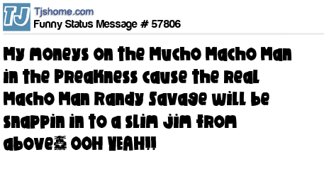 X my moneys on the Mucho Macho Man in the Preakness cause the real Macho Man Randy Savage will be snappin in to a slim jim from above~ OOH YEAH!!