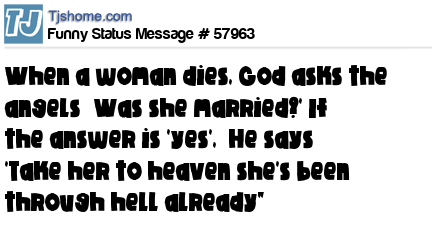 - # 141324 When a man dies, God asks his angels; "Was he married? If the answer is "Yes" God says, 'Take him straight to heaven he's already been through enough hell"