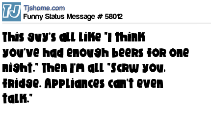 X This guy's all like "I think you've had enough beers for one night." Then I'm all "Scrw you, fridge. Appliances can't even talk."