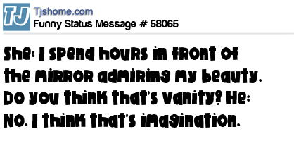 X is She: I spend hours in front of the mirror admiring my beauty. Do you think that's vanity? He: No. I think that's imagination.