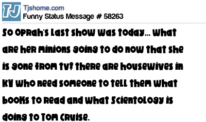 X so Oprah's last show was today... what are her minions going to do now that she is gone from tv? there are housewives in KY who need someone to tell them what books to read and what Scientology is doing to Tom Cruise.